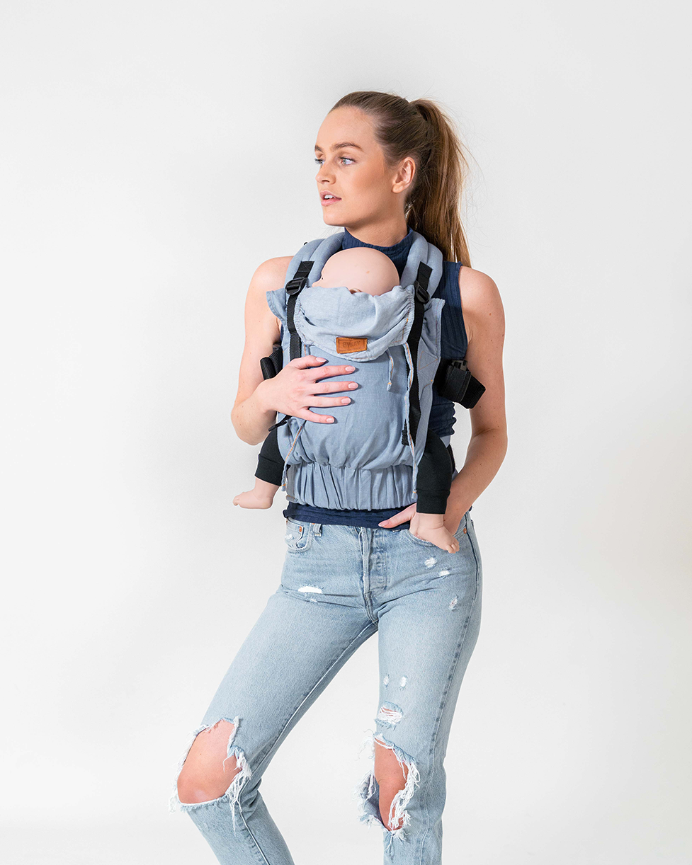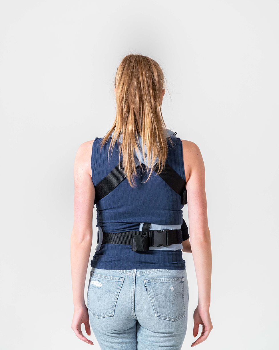 Die Breite der Babyschale beträgt für eine ergonomische M-Position mit Unterstützung von Kniekehle zu Kniekehle maximal 40 cm. Diese lässt sich stufenlos auf 20 cm verringern, indem der Stoff über den Hüftgurt geschoben wird.