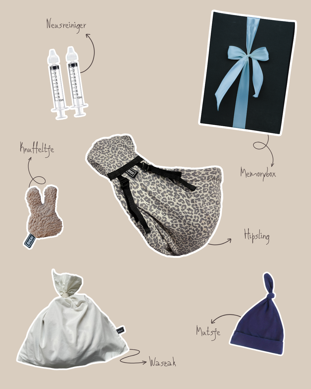 It’s packed with essentials: a Stretchy Deluxe baby sling, a hat, a cuddly toy, a laundry bag, a nasal aspirator, a beautiful memory box to capture all those first moments, and a handwritten card.