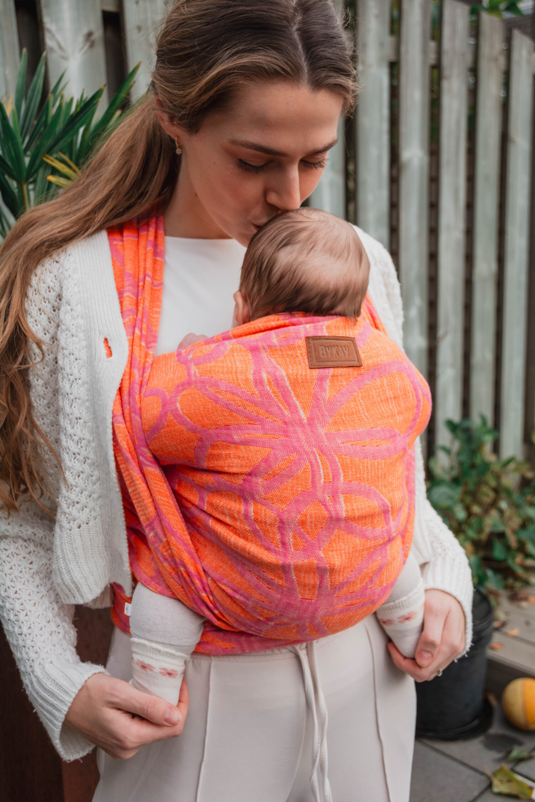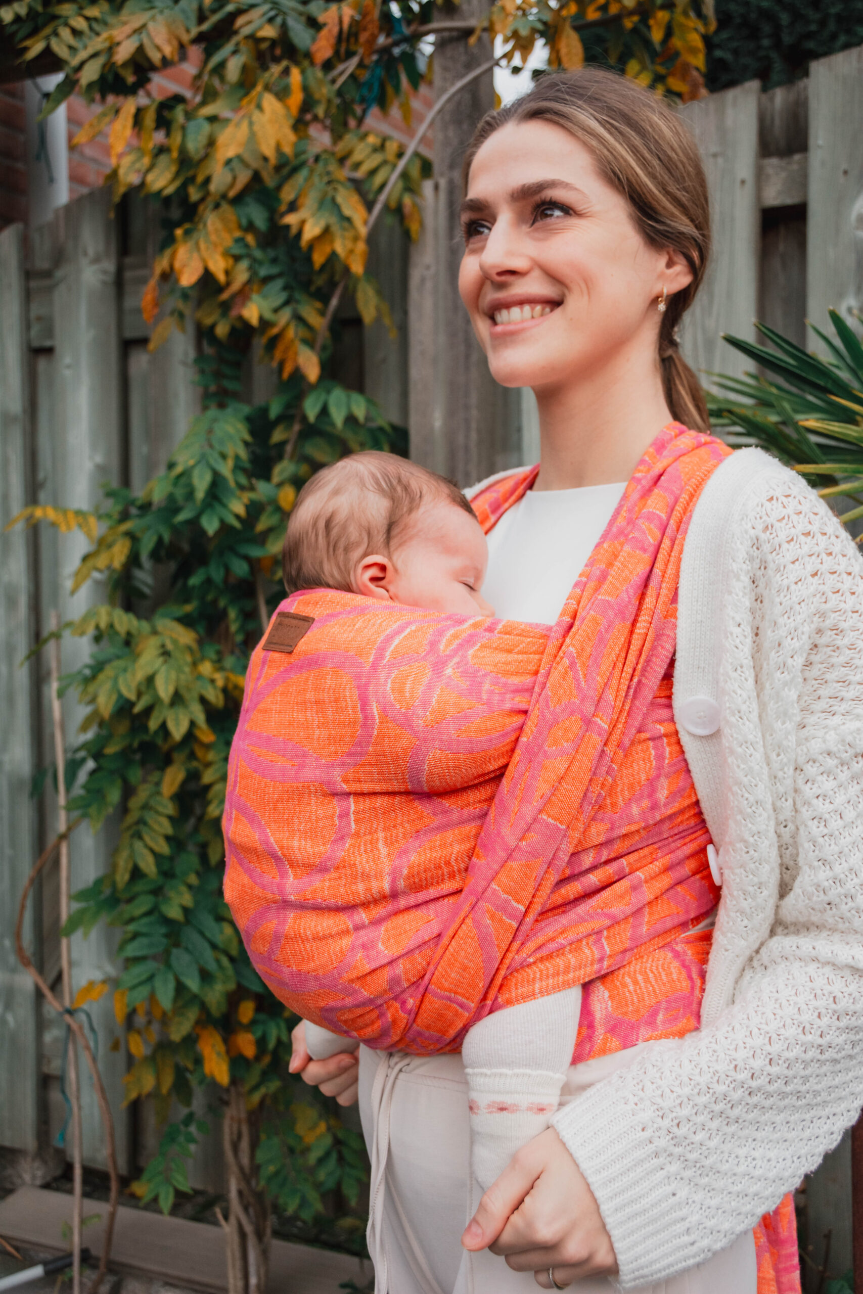 Liever een roze draagdoek met oranje bloemen? Je kunt deze draagdoek ook omdraaien voor een hele nieuwe look! Twee in één, hoe leuk is dat?