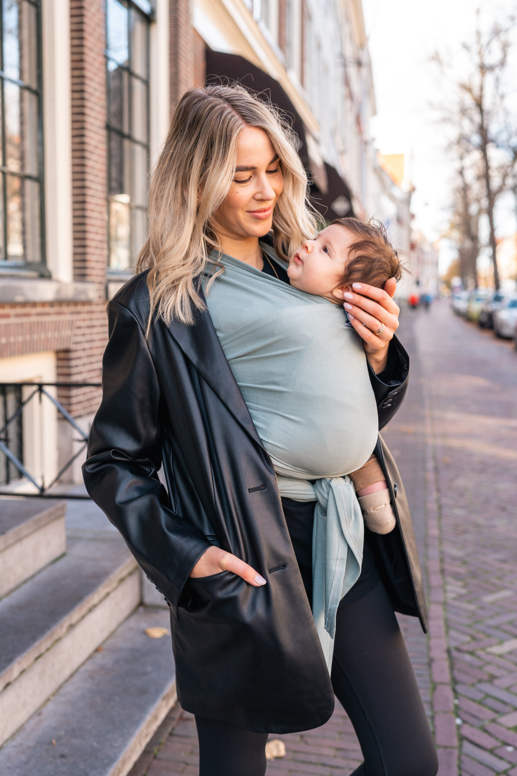 De rekbare draagdoek muntgrijs is onmisbaar als je lekker lang wilt dragen. Je kunt deze draagdoek al vanaf de allereerste dag gebruiken, tot wel 18 kilo. Je draagt je baby op je buik, en later eventueel op je heup, zodat je baby wat gemakkelijker met je mee kan kijken.