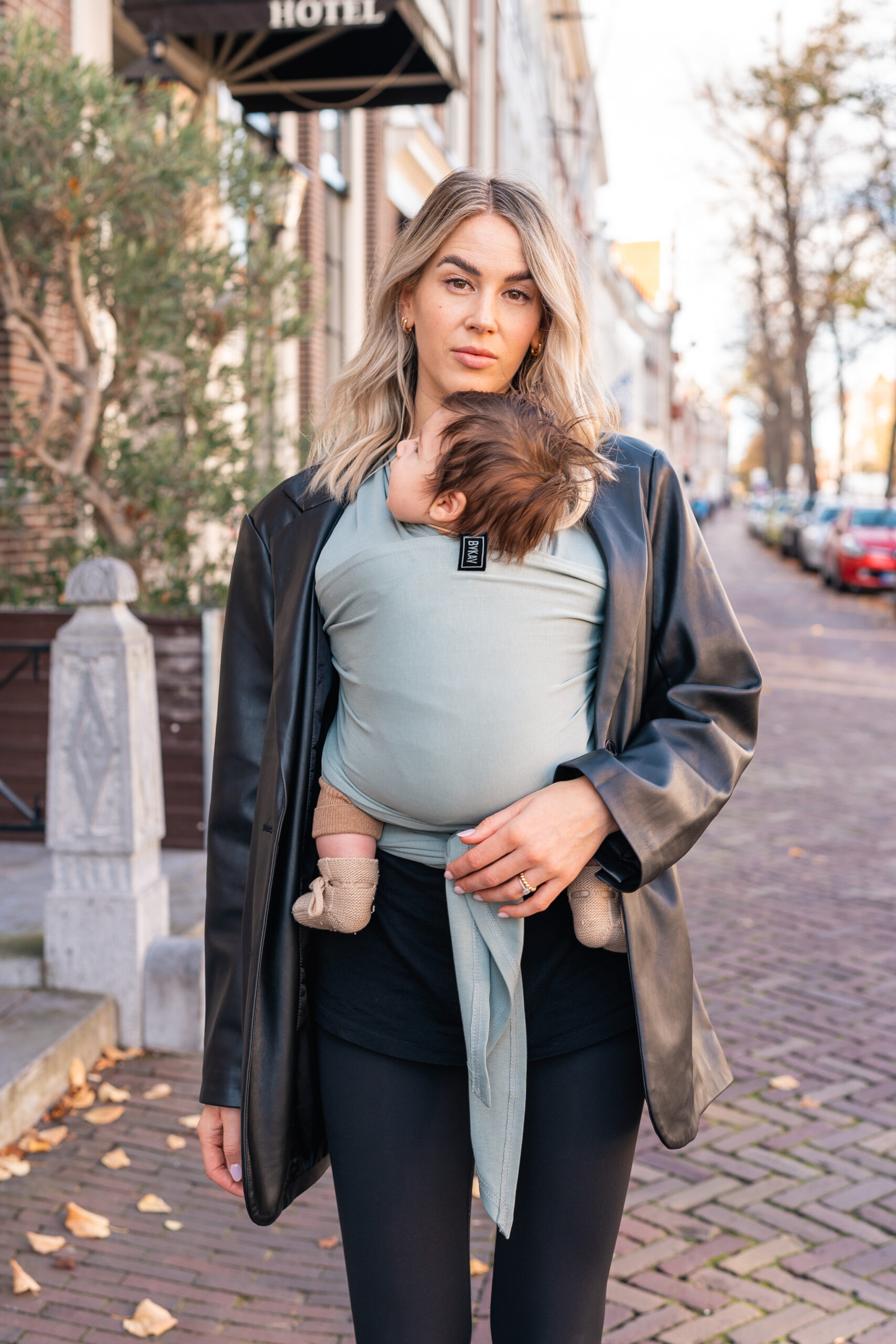 Je knoopt de rekbare draagdoek minty grey eerst om, waarna je je baby veilig en geborgen erin stopt. Het knopen van de uiteinden van de draagdoek kan op je rug, heup of buik. Een draagdoek sluit altijd naadloos aan op de maat van je baby. Er zit geen limiet aan het dragen in een draagdoek, want dragen bevordert de fysieke en mentale ontwikkeling.